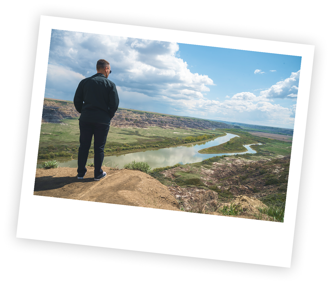 High above the Red Deer River, this viewpoint serves up some of the best views in the valley. It is perfect for romantic couple shots, epic solo portraits, or that family photo that ends up framed on the wall for the next ten years.